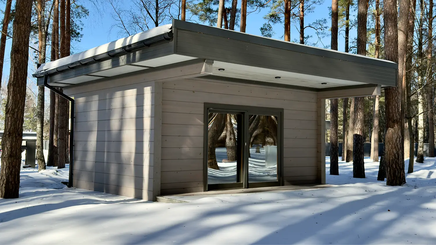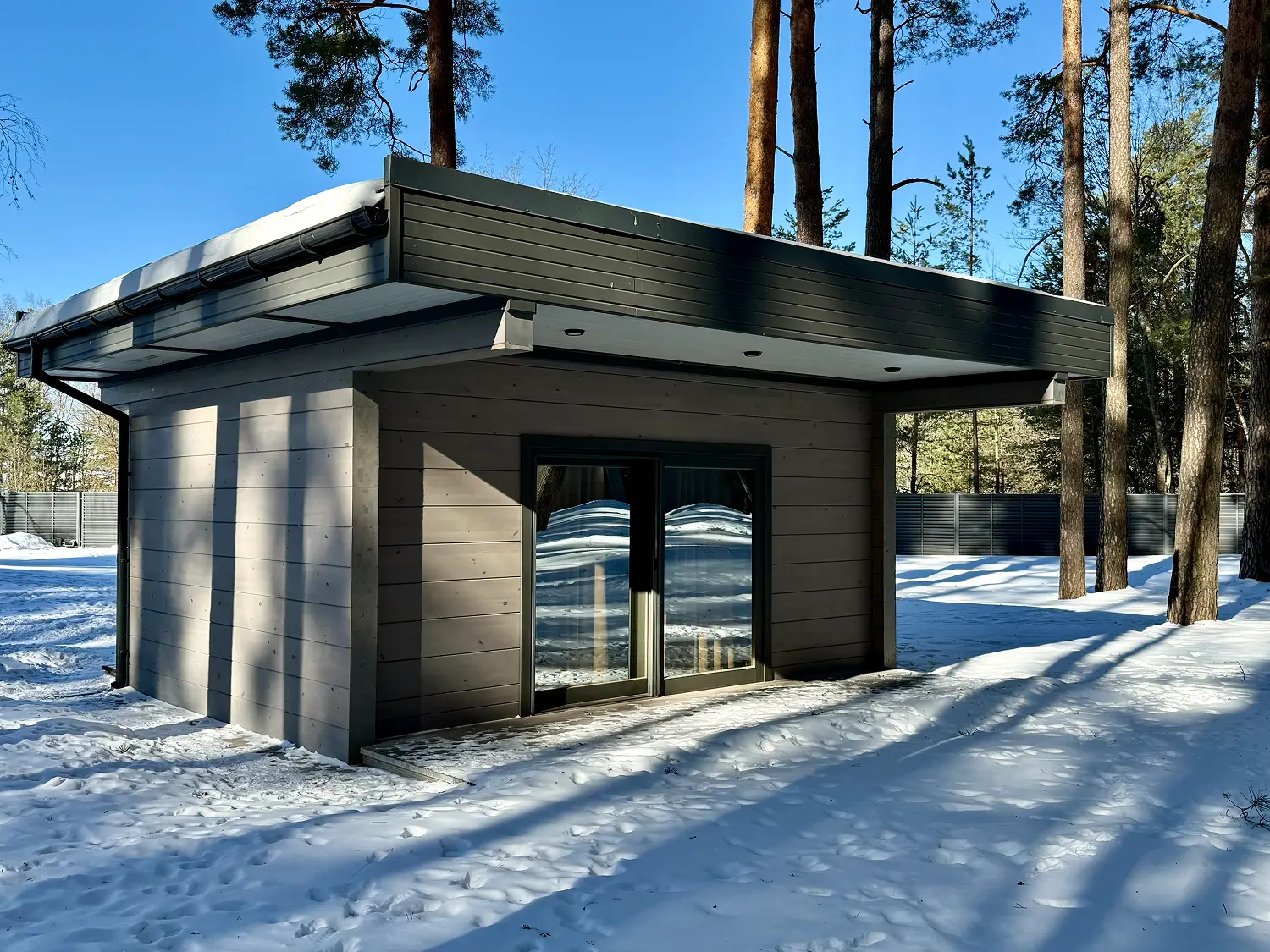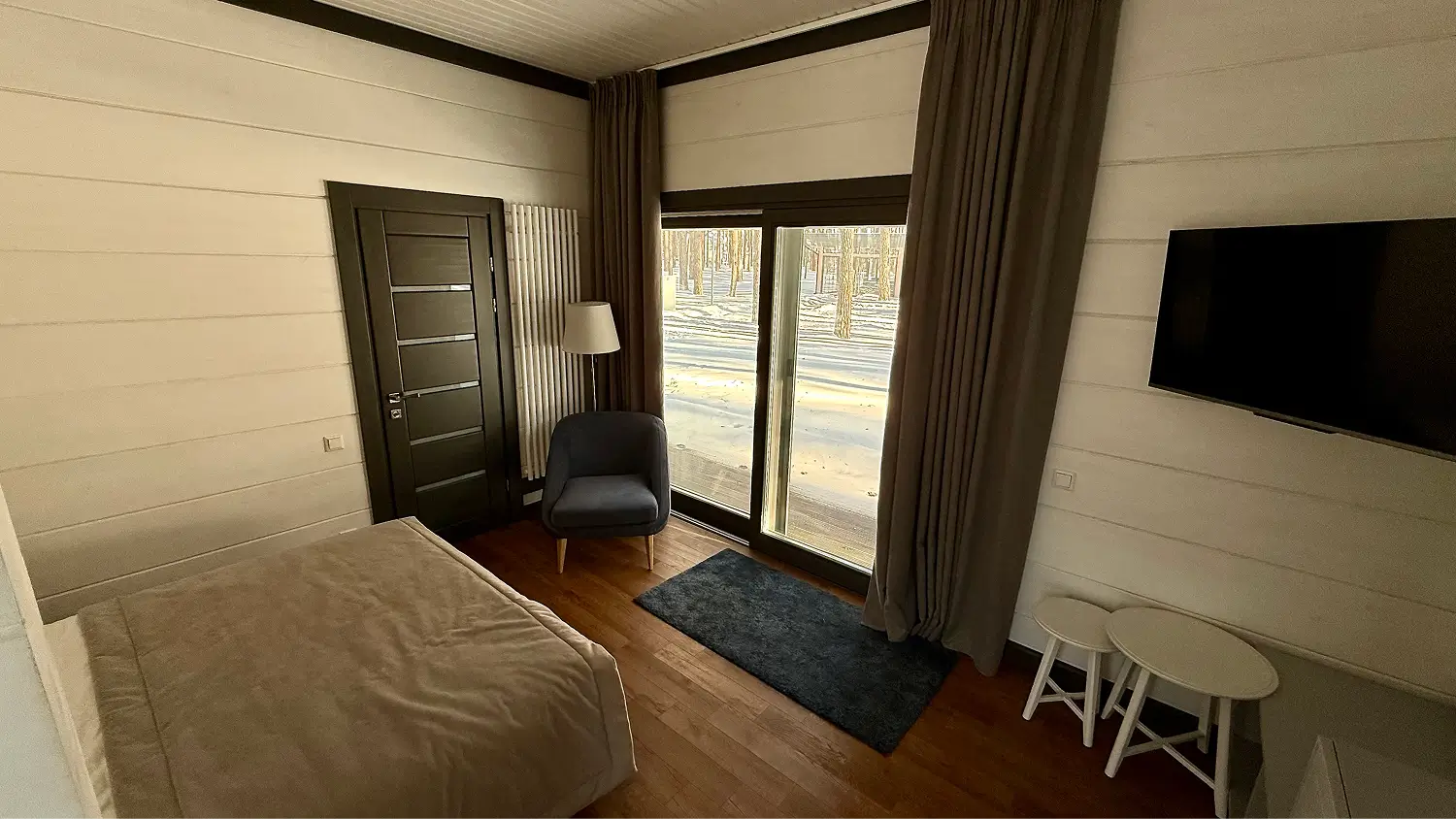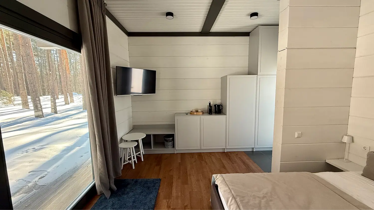 Уютный дом с панорамными окнами рассчитан на двух гостей. Это формат приватного отдыха — без соседей и посторонних.